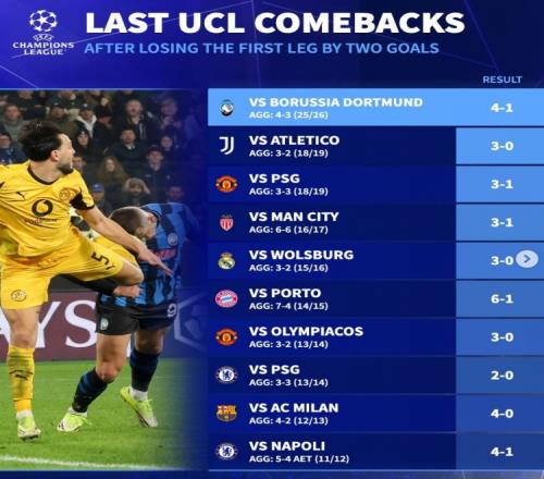 体育播报2月26日宣 亚特兰大在本轮欧冠淘汰赛附加赛首回合0-2落后情况下,次回合4-1大胜多特蒙德,完成逆转晋级。《转会市场》也统计了近年欧冠淘汰赛首回合两球落败但最终晋级的对决: