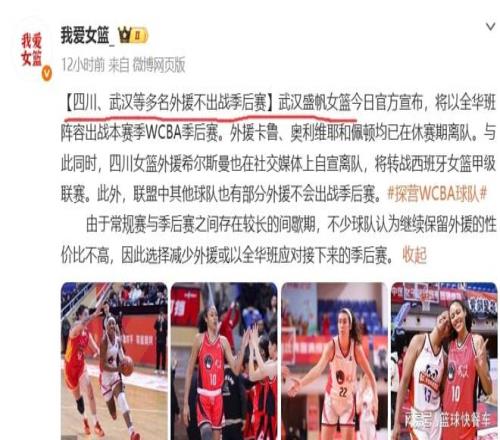中国女篮的天塌了,根据知情人士透露,WCBA女篮季后赛恐怕将面临一大尴尬境地,由于常规赛与季后赛相间时间太长,不少外援已经选择不在继续为WCBA联赛效力了,转而加盟其他海外联赛了。武汉女篮已经正式宣布,他们将以全华班出战季后赛,而争冠大热门球队四川队,他们也放弃了外援希尔斯曼。从这一点上来看,今年的WCBA季后赛,恐怕更无亮点可言了。