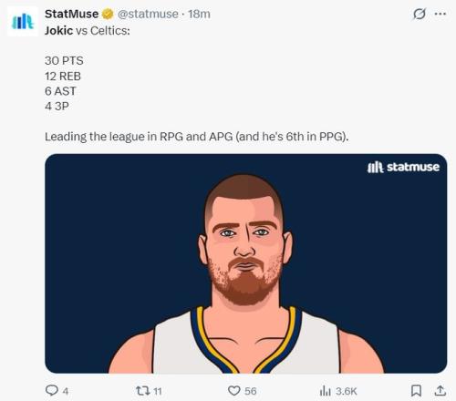 这场比赛约基奇33分钟,28中11,三分13中4,罚球7中4,拿到30分12篮板6助攻,命中率39.3%,三分命中率30.8%,真实命中率48.3%,正负值+13,他在末节只打了3分钟就早早打卡下班了。