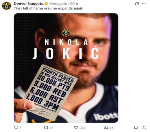 掘金官方晒出约基奇已经完成20000分+9000篮板+6000助攻+1000三分,他是历史第四位达成这一数据的球员,前三位是皮蓬、詹姆斯、威少,当然约基奇也是唯一能达成这样数据的中锋球员。