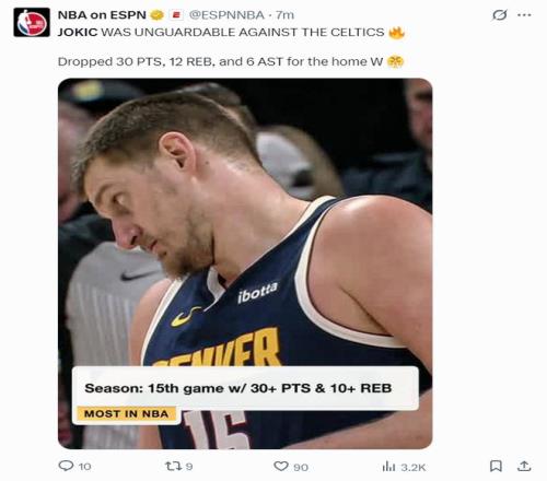 约基奇本赛季已经完成第15次30+10,就连NBA官方都盛赞约基奇在对阵绿凯的比赛中不可阻挡。(约基奇打常规赛跟打全明星的确是判若两人)