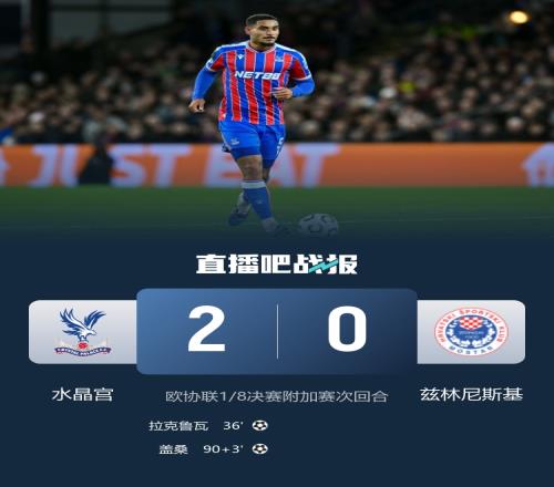 欧协联附加赛次回合,沃顿助攻拉克鲁瓦头球首开记录,盖桑破门,水晶宫2-0总比分3-1兹林尼斯基晋级16强。