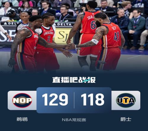 首节开打后两队迅速进入状态,萨迪克·贝连投带罚予取予求,贝利单节14分强势回应,首节结束时爵士领先1分,次节回来,双方火力不减继续对攻,但中段爵士进攻出现停滞,锡安率队抓住机会拉开比分,半场战罢,鹈鹕确立17分优势。易边再战后鹈鹕延续状态,双方分差越来越大,末段爵士回敬11-0攻击波稍稍缩小分差,三节结束后鹈鹕依然领先15分,末节上来,鹈鹕一波8-2扩大优势,爵士没有放弃继续追分,但鹈鹕顶住对手反扑,最终鹈鹕129-118击败对手迎3连胜,同时送给爵士4连败。