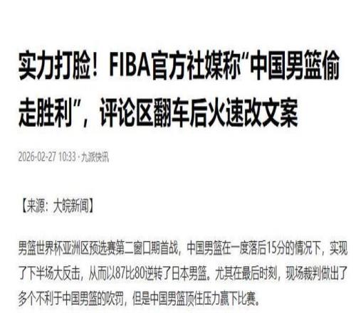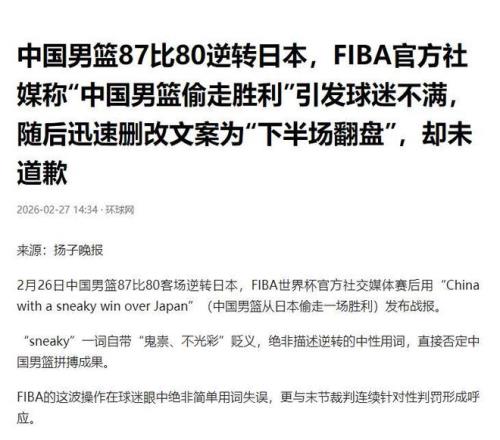 北京时间2月27日傍晚,国际篮联在官方社媒发布声明,就昨天关于中日男篮比赛结果的措辞不当致歉。2月26日,中国队...
