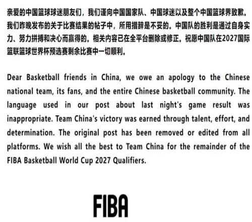 北京时间2月27日傍晚,国际篮联在官方社媒发布声明,就昨天关于中日男篮比赛结果的措辞不当致歉。2月26日,中国队...