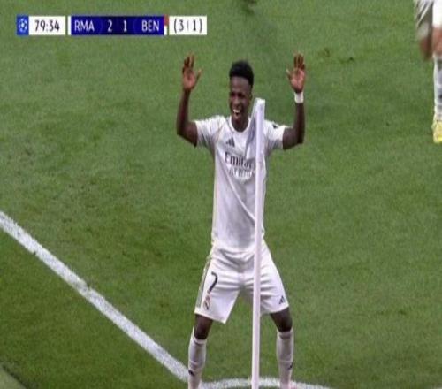 比赛第80分钟,维尼修斯接巴尔韦德直塞后高速突破,在大禁区线上冷静低射远角得手,将比分锁定为2-1。这一进球彻底浇灭了本菲卡翻盘的希望。进球后,维尼修斯迅速奔向角旗区,做出了与首回合客场对阵本菲卡时完全相同的舞蹈庆祝动作。