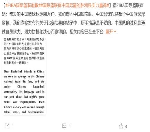 而在昨天晚上,国际篮联再次向中国男篮、球迷进行了一次隆重的道歉。不过,国际篮联道歉的真实原因并非裁判的争议执法,而是他们自身的用词错误。这一道歉,显然难以让中国球迷接受。