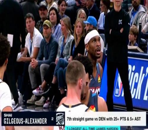 亚历山大连续7次对阵掘金拿到至少25分5助,追平哈登保持的纪录。