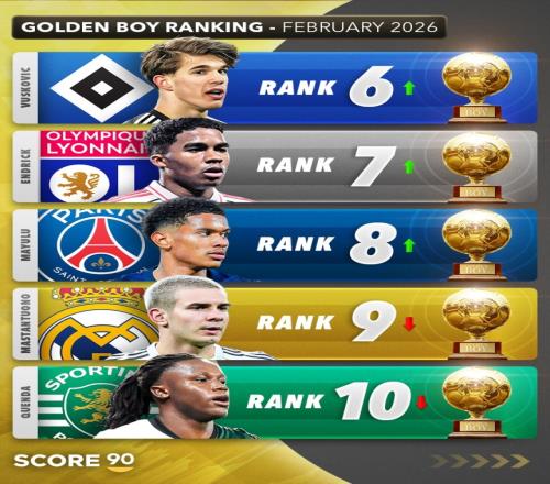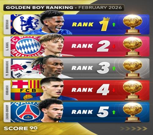 体育播报02月28日宣 Score90给出了2026年金童奖2月份最新排名预测,埃斯特旺升至榜首,卡尔第二,迪奥曼德升至第三。