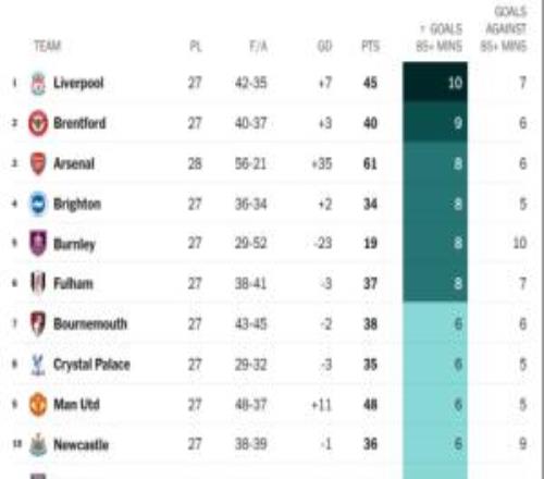 英超85分钟及以后球队进球榜:利物浦10球居首,阿森纳8球第三