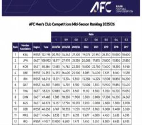 亚足联俱乐部赛事中期排行:沙特联居首中超第八仅领先澳超2.8分
